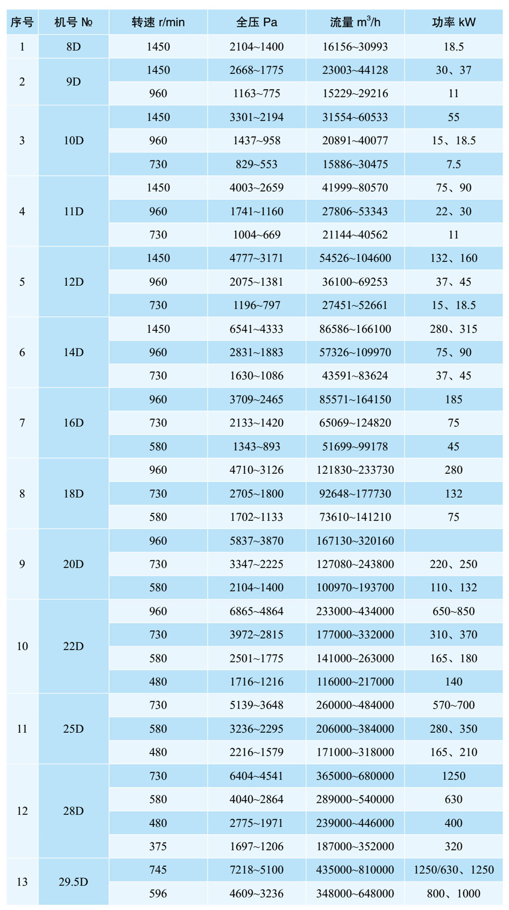 1、本風(fēng)機制成單吸入,機號有№4、№5、№5.6、№6.3、№7.1、№8、№9、№10、№11.2、№12.5、№14、№16十三個機號。